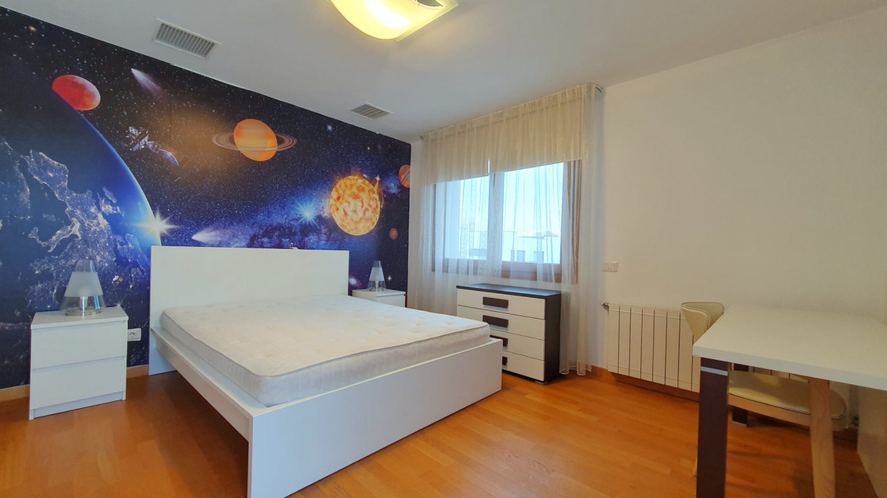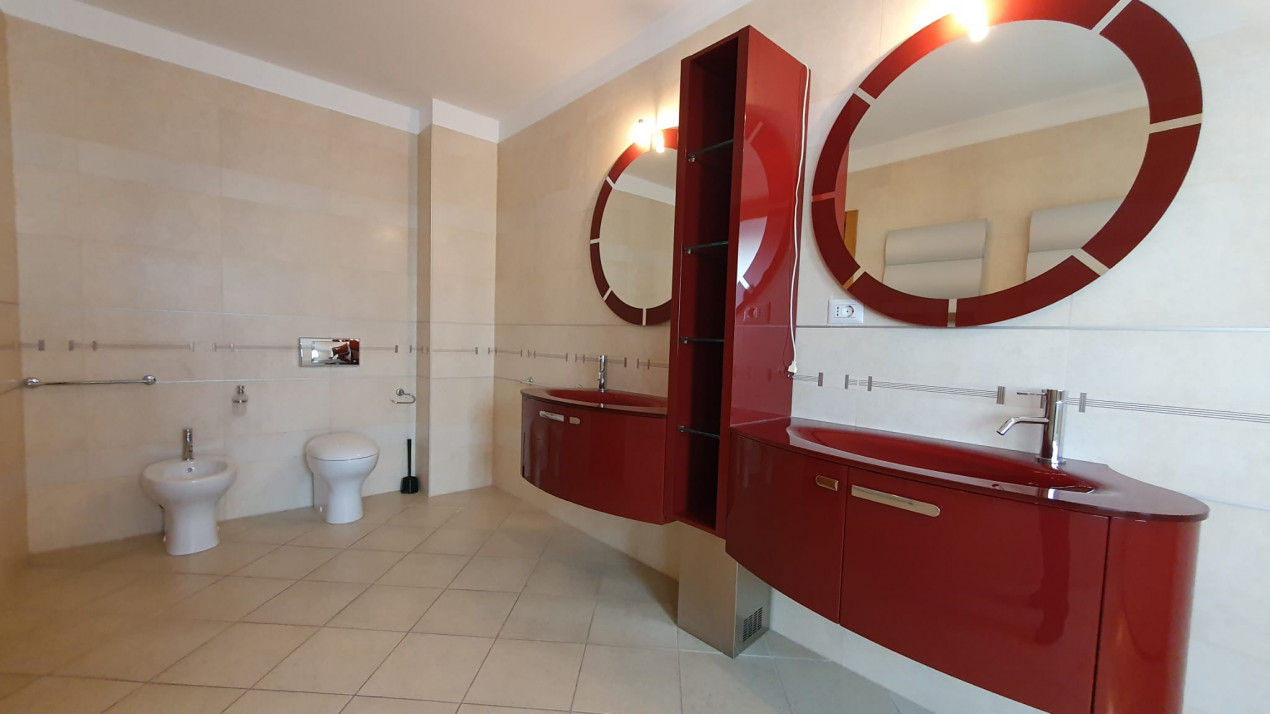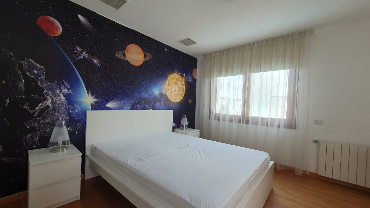 Parterul mai include o cameră tehnică bine organizată și un grup sanitar, iar pentru a-ți proteja autoturismele, vilă dispune de un garaj dublu generos, unde poți parca două mașini în condiții optime. În plus, ai și un loc de parcare în exterior, pentru oaspeți.