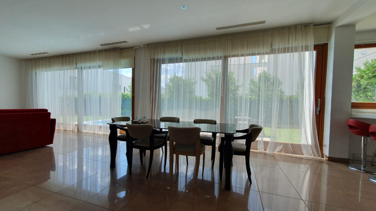 La intrarea în vilă, ești întâmpinat de un vestibul primitor, care deschide calea către livingul generos și zona de dinning. Aceste spații sunt concepute într-un mod deschis, oferind un sentiment de unitate și libertate în interior. Bucătăria deschisă este complet utilată și mobilată cu bun gust, fiind pregătită să satisfacă cele mai exigente nevoi culinare.