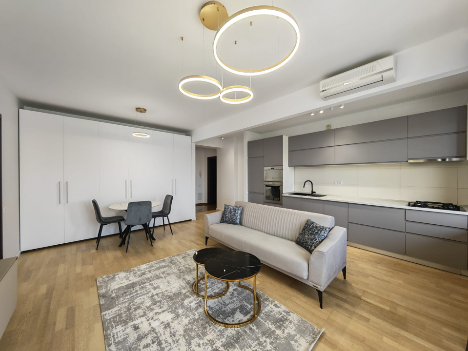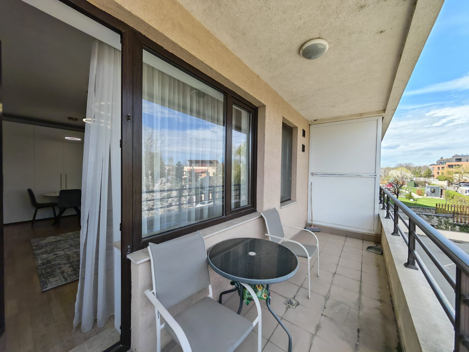 Apartamentul este la etajul 1 al unui bloc de 7 etaje, într-un complex cu pază și supraveghere, retras de la traficul aglomerat. Are o suprafață utila de 56 mp, la care se adaugă un balcon de 8 mp, mobilat modern si complet utilat, cu o compartimentare practică: living cu bucătărie open-space care poate fi închisă, dormitor, un grup sanitar și o baie cu fereastră pentru ventilație si lumină naturală.